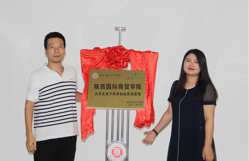 国际经济学院院长助理冯明副教授与与西安新丝路国际电子商务产业园企划部王雨晨总监为“大学生电子商务创业实训基地”揭牌