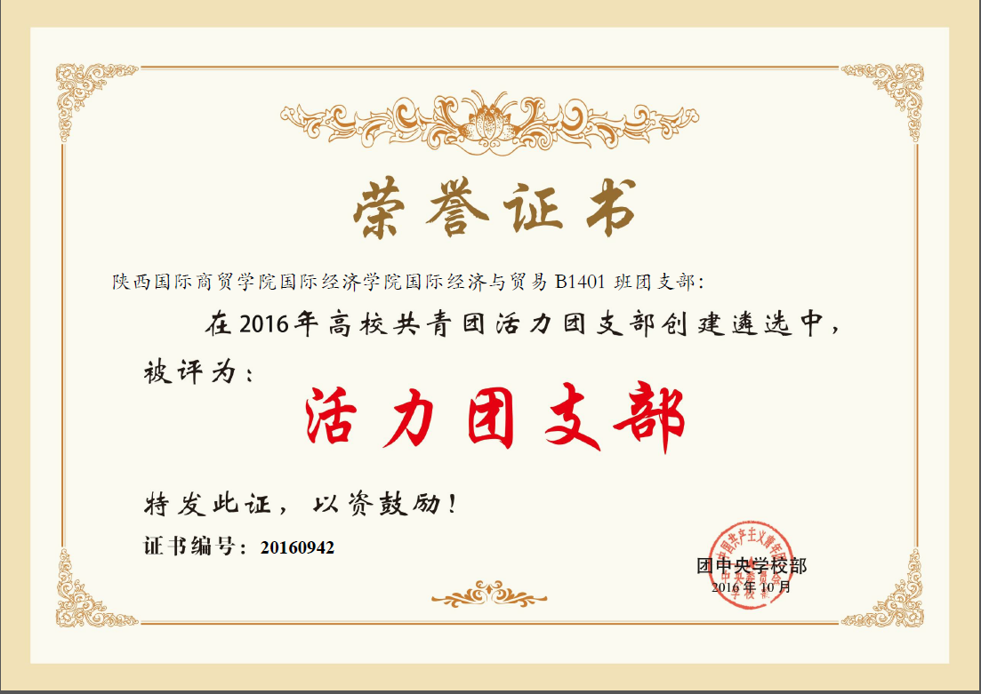 2016年国贸B1401班团支部被团中央授予全国“活力团支部”
