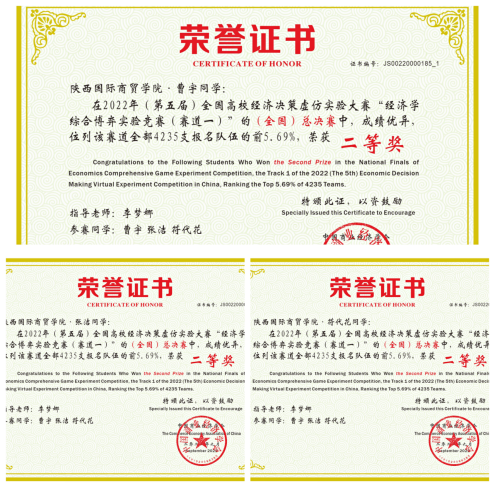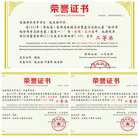 赵俊梅组与曹宇组均在“经济学综合博弈实验竞赛(赛道一)”通过了校赛,区域赛、数据分析报告以及最终的全国总决赛,最后双双获得二等奖。