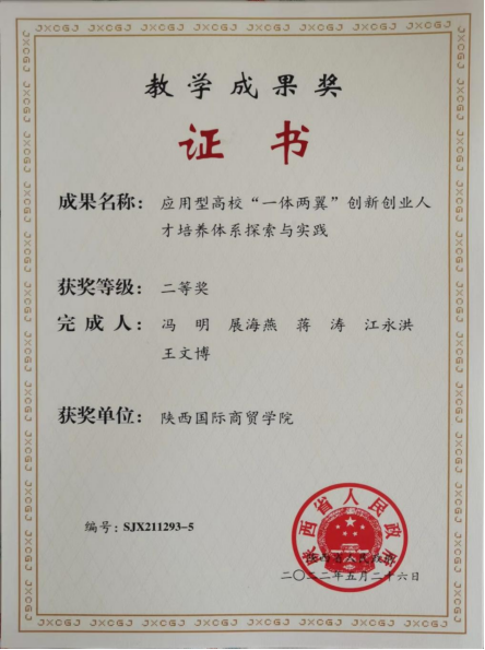 近日,陕西省人民政府办公厅公布了《陕西省人民政府办公厅关于表彰陕西省2021年高等教育教学成果奖获奖项目的通报》(陕政办函〔2022〕64号),我院冯明老师主持的“应用型高校‘一体两翼’创新创业人才培养体系探索与实践”荣获二等奖。
