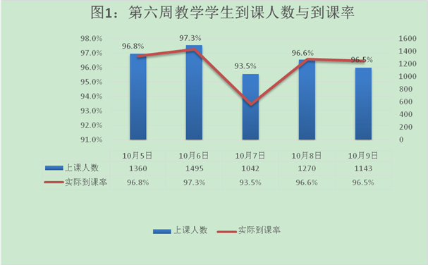 本周学生到课应到6557人次,实到6310次,总体到课率96.2%,10月5日至10月9学生实际到课情况见图1。