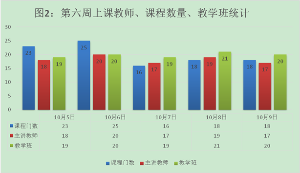 本周上课时间为5天。学院第六周计划开出课程100门次,实际开出100门次,课程开出率为100%。总体运行情况具体见表 1。