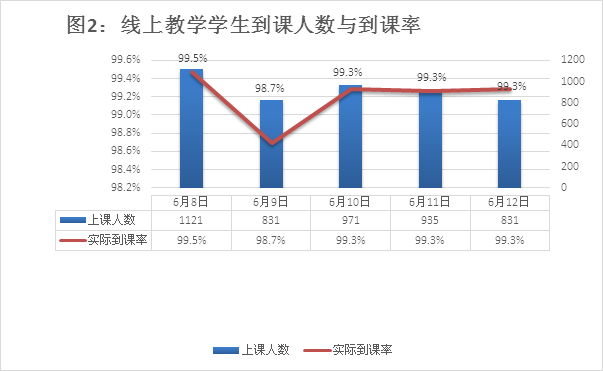 本周学生到课应到4726人次,实到4689,总体到课率99.21% ,学生每天实际到课情况见图1。