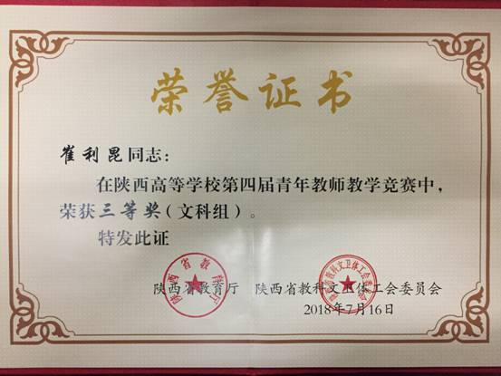 ——国际经济学院教师在陕西省高等学校第四届青年教师教学竞赛中荣获(文科组)三等奖。2018年6月29日,由陕西省教育厅和陕西省教科文卫体工会委员会联合主办的陕西省高等学校第四届青年教师教学竞赛在陕西师范大学举行,共有来自省内87所高校的174名青年教师参加了文科、理科、工科以及思想政治课专项四个组别的角逐。我院选派出的崔利昆老师凭借在比赛中的优异成绩,荣获大赛文科组三等奖。
