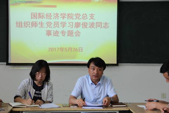 为了进一步推动“两学一做”学习教育的深入开展,在全院上下形成“学先进、赶先进”的浓厚氛围,5月26日下午16:00,国际经济学院党总支在2J320教室召开“学习廖俊波同志先进事迹”专题会议,党总支副书记张孝峰及全体师生党员参加了会议,会议由教工党支部书记张艳主持。