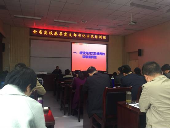 在开班仪式上教委高教工委书记董小龙作了开班式暨专题报告,他从三个方面讲解了这次举办示范培训班的意义,他指出高校基层党支部书记对党务基本知识要知其然要知所以然,要增强四个意识,这次示范班是落实全会精神的需要,是加强高校基层党组织建设薄弱环节的需要,是应对严峻挑战的需要,是带领带动基层党支部书记明确目标要求,探索新思路的需要,是助力全省追敢超越的需要。他要求广大学员要端正态度、认真学习,理论联系实际,严格遵守纪律,相互交流,确保本次示范班圆满完成。