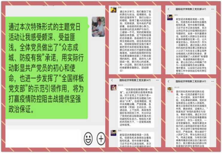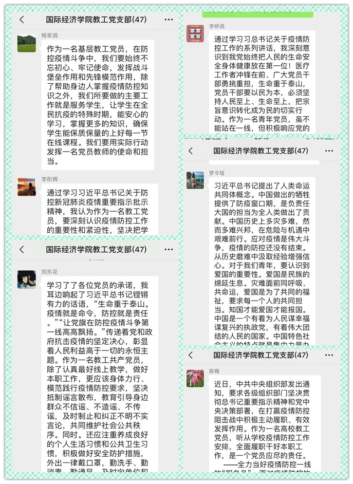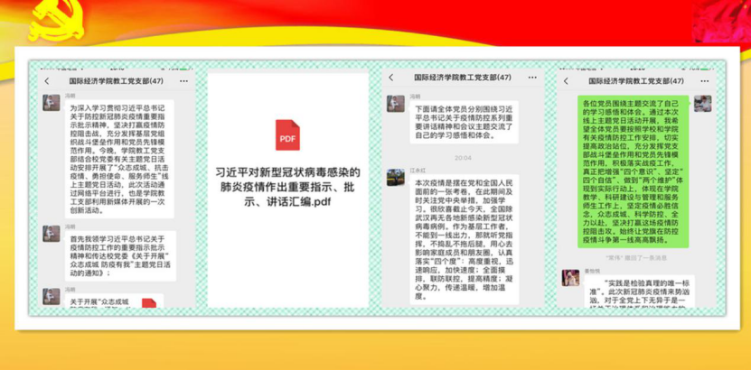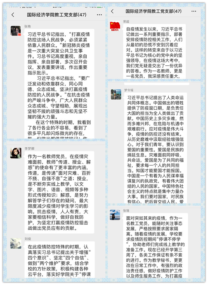 为深入学习贯彻习近平总书记关于新冠肺炎疫情防控重要指示批示精神,坚决打赢疫情防控阻击战,充分发挥基层党组织战斗堡垒作用和党员先锋模范作用。3月1日晚,国际经济学院教工党支部结合校党委有关主题党日活动安排开展了“众志成城、抗击疫情、勇担使命、服务师生”线上主题党日活动,号召广大党员在疫情防控斗争中争做先锋,用实际行动践行入党的初心和使命。此次活动通过网络平台进行,是学院教工支部利用新媒体开展的一次创新活动。