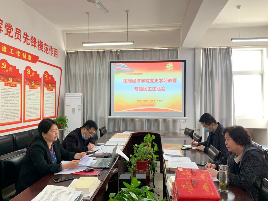 根据学校党委《关于开好党史学习教育专题民主生活会的通知》(陕商院党〔2022〕4号)文件精神及有关要求,3月9日上午,国际经济学院领导班子召开党史学习教育专题民主生活会。会议以“大力弘扬伟大建党精神,坚持和发展党的百年奋斗历史经验,坚定历史自信,践行时代使命,厚植为民情怀,勇于担当作为,团结带领人民群众走好新的赶考之路”为主题,按照“学史明理、学史增信、学史崇德、学史力行”和“学党史、悟思想、办实事、开新局”目标要求,紧密结合学院领导班子和班子成员个人思想工作实际,深入开展对照检查,深刻剖析问题根源,严肃开展批评和自我批评,进一步增强了学院领导班子的凝聚力和战斗力。党总支副书记路敏主持会议。