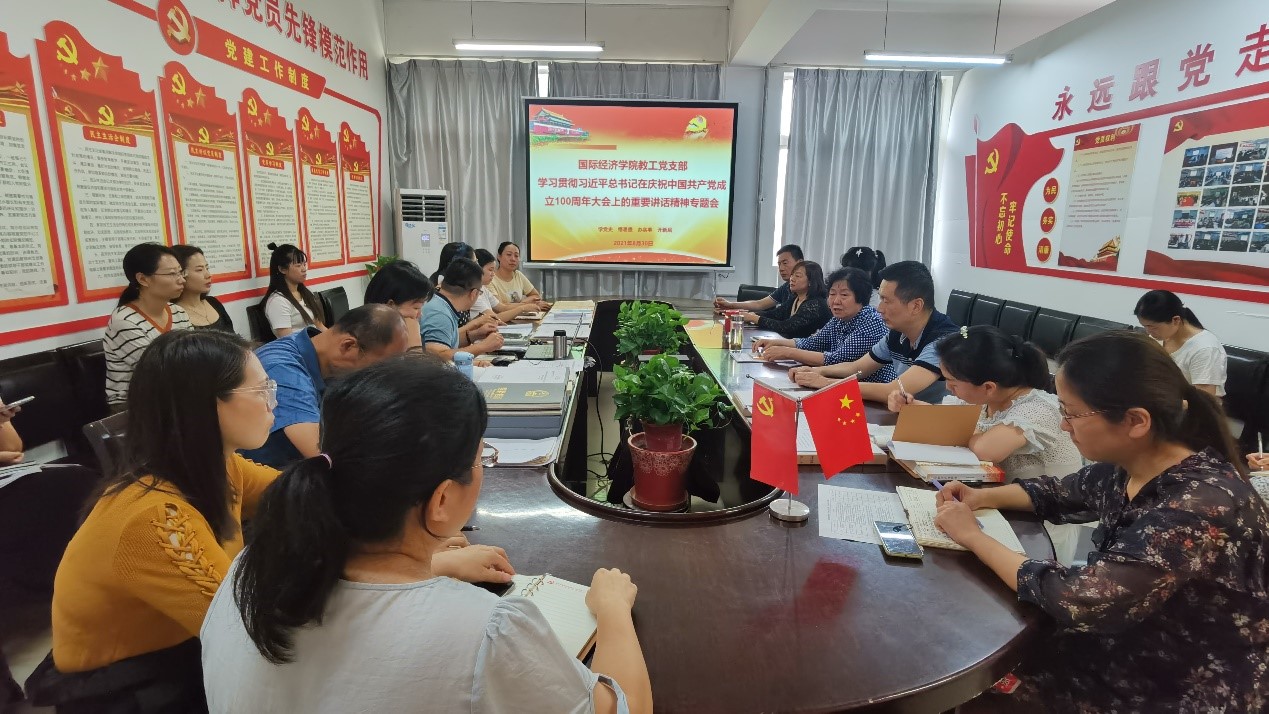 8月30日,国际经济学院教工党支部在党员活动室召开“学习习近平总书记在庆祝中国共产党成立100周年大会上的重要讲话精神” 座谈会,学院院长韦林珍教授及全体教工党员参加了本次会议,会议由教工党支部书记冯明主持。