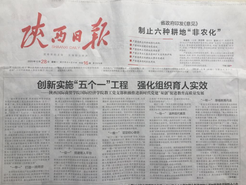 2020年12月28日,《陕西日报》刊登了我院全国党建工作样板支部“创新实施‘五个一’工程,强化组织育人实效”特色工作案例纪实报道。(http://esb.sxdaily.com.cn/pc/content/202012/28/content_745071.html)
