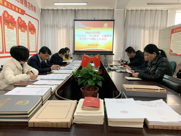 2019年12月5日,国际经济学院在党员活动室召开“不忘初心、牢记使命”主题教育领导班子专题民主生活会,学院全体领导班子成员参加会议,校内巡回指导组第三指导组组长郭静到会指导,学院总支委员荣超、张艳,学生支部书记李彤辉列席会议,会议由学院党总支副书记张孝峰主持。