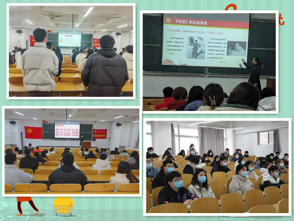 为深入学习宣传贯彻党的十九届六中全会精神,把广大师生的思想和行动统一到全会精神上来。12月15日15点,国际经济学院党总支邀请马克思主义学院教研室主任展海燕副教授为我院师生作了党的十九届六中全会精神解读专题宣讲。参加会议的有国际经济学院师生党员、团学骨干、学生代表等一百余人聆听讲座,会议由学院党总支副书记路敏主持。