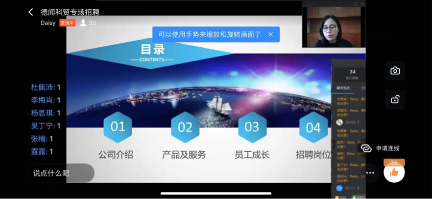 招聘会上,由德闻科贸有限公司的人事经理Daisy为同学们播放了德闻科贸的ppt,通过ppt的讲解让同学们了解了德闻科贸的公司介绍、产品及服务、员工成长、以及对本次校园招聘的岗位需求,最后Daisy与同学们进行了互动,一一回答了同学们的问题,并鼓励同学积极加入德闻科贸,成为公司的一员。