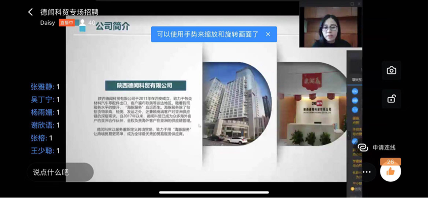 为了缓解学生就业压力,积极帮助未就业学生就业,进一步做好毕业生就业工作,国际经济学院组织毕业生于2021年10月29日在钉钉会议召开线上专场招聘会。本次邀请了陕西德闻科贸有限公司进行线上宣讲招聘。
