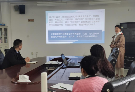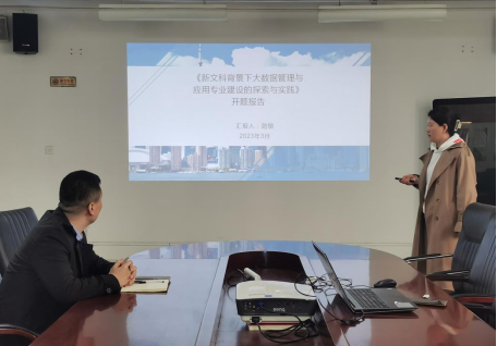 首先,项目负责人路敏以《新文科背景下大数据管理与应用专业建设的探索与实践》为题从研究背景、思路、内容、目标以及研究计划与预期成果等方面进行汇报。
