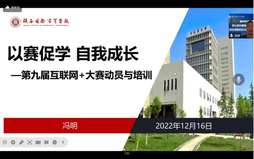 为更好地指导我院师生参加第九届中国“互联网+”大学生创新创业大赛,深入开展创新创业教育改革,强化创新创业实践,提高教师创新创业实践指导能力,培养学生创新创业思维及实践能力,国际经济学院于2022年12月16日下午在线上开展第九届中国国际“互联网+”创新创业大赛启动及培训会。此次会议由学院创新创业教研室主任李宁馨主持,学院党总支副书记荣超、副院长冯明、全体专职教师、辅导员老师及全体学生参加会议。