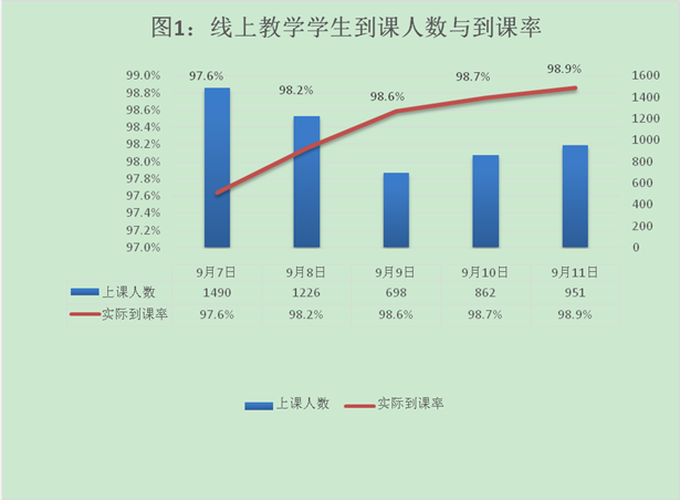本周学生到课应到5318人次,实到5227,总体到课率98.3%,9月7日至9月11日学生实际到课情况见图1。