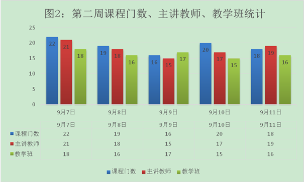 本周26名教师本周累计上课41门次,累计上课节次205次,总体运行情况见表2。