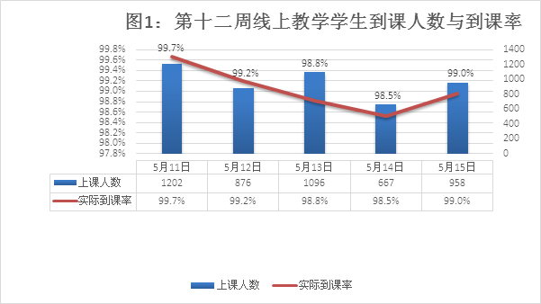 本周学生到课应到4843人次,实到4799,总体到课率99.09% ,学生实际到课情况见图1。