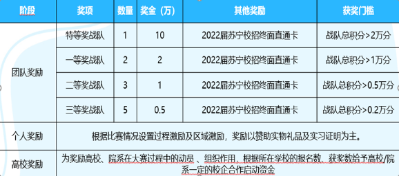 本届创业实践大赛设立了丰富的各类奖励,包括:最高10万元现金奖金、2022届苏宁校招终面直通卡、实习证明、参赛证书、各类实物及权益大礼包等,具体如下: