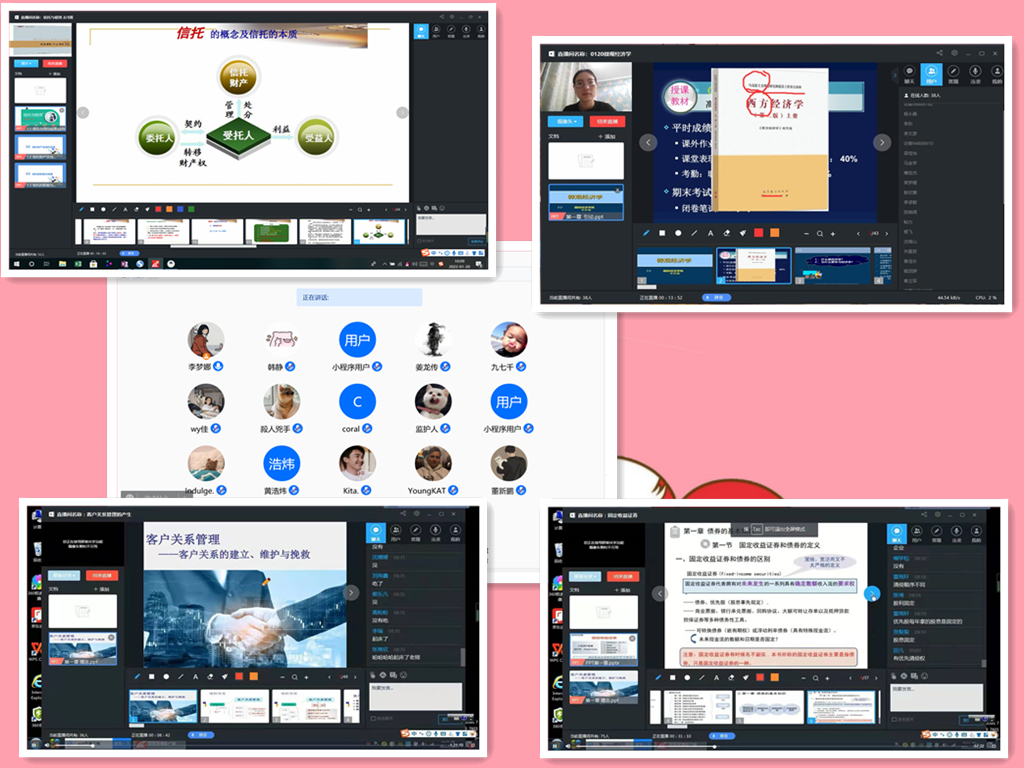 我院从12月21日起开始全面进行线上教学工作,学生们的课堂从教室搬到宿舍,师生互动从面对面交流变成云端隔屏对话。金融教研室全体教师坚守岗位,有序的开展毕业论文开题答辩、期末复习、组织考试、课题申报研讨、新学期授课等各项工作,积极联系各大书商及出版社,获取教材的电子版,确保教学进度不拖后、教学质量不降低。师生们通过学习通平台、超星直播平台、腾讯会议、手机微信群、QQ等多种渠道进行沟通交流,及时了解和帮助学生在学习生活中遇到的困难。