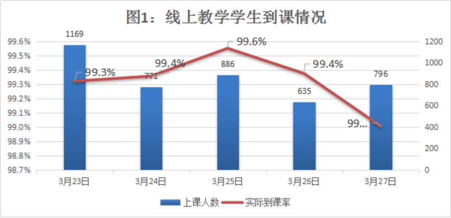 本周学生到课应到4286人次,实到4257人次,总体到课率99.32%,周一至周五学生实际到课情况见图1。