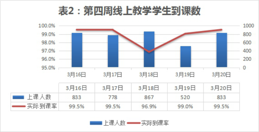 本周学生到课应到3876人次,实到3831人次,总体到课率98.84%,周一至周五学生实际到课情况见表2。