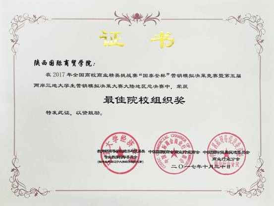 此次大赛由教育部高等学校经济与贸易类专业教学指导委员会、中国国际贸易促进委员会、中国国际商会商业行业商会联合主办。“国泰安杯”营销模拟决赛是全国高校商业精英挑战赛系列赛事之一,创办于2011年,已经连续6年成功举办,目前发展成为我国国际贸易教育领域,校企合作最深入、国际交流最广泛的跨专业综合实践平台,培养了大批应用型、复合型经贸人才。