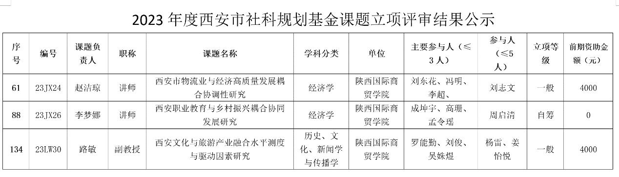近日,西安市社会科学规划基金管理办公室公布了《关于2023年度西安市社会科学规划基金课题立项的通知》文件,陕西国际商贸学院共获批立项8项,其中国际经济学院获批立项3项,一般项目2项,自筹项目1项。