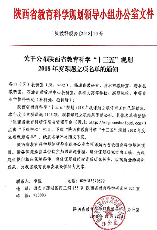 陕西省教育科学规划领导小组办公室立项课题为省级教育科学规划项目,请获批的课题组按时完成研究任务,以高质量的研究成果,为我院教育发展提供智力支撑。