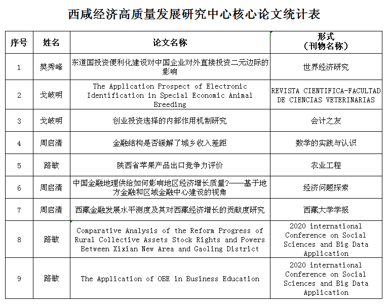 西咸经济高质量发展研究中心2020年核心论文统计表