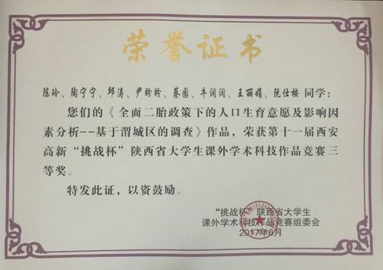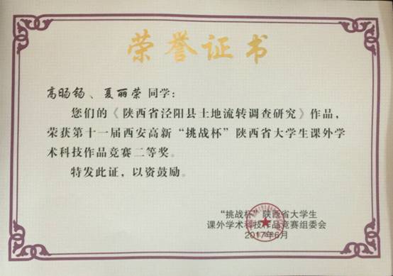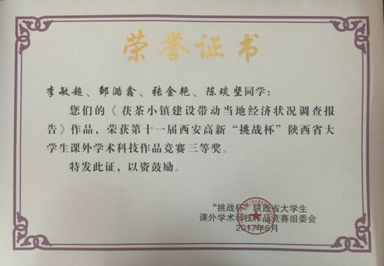 2017年6月12日,由团省委、省教育厅、省科技厅、省学联、西安高新区管委会、省科学院、省社科院共同主办的第十一届西安高新“挑战杯”陕西省大学生课外学术科技作品竞赛终审决赛揭晓,国际经济学院推选的参赛作品分获竞赛二等奖3项、三等奖2项,获奖等级和数量在创历史新高。