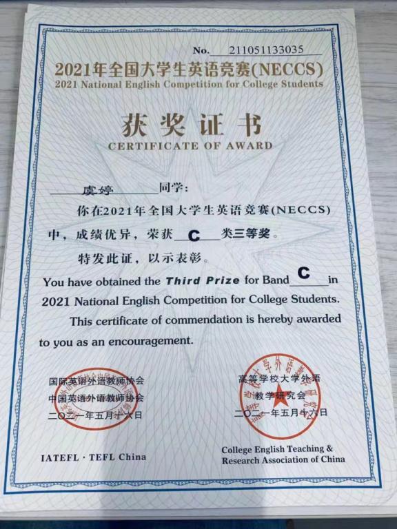 她性格开朗,爱好广泛,在学习期间积极参加学校组织的各种活动,先后获得全国英语竞赛三等奖、全国“一带一路”创意宣传活动一等奖、咸阳市慈善扶贫公益志愿者、校优秀志愿者、新东方年度优秀实习生等奖项及称号,她积极向上,对工作认真负责,有上进心,喜欢高难度挑战,提升自身能力与综合素质。她是一个很有时间观念的人,能积极认真做好每件事,待人真诚,善于沟通,有较强的组织能力与团队精神。