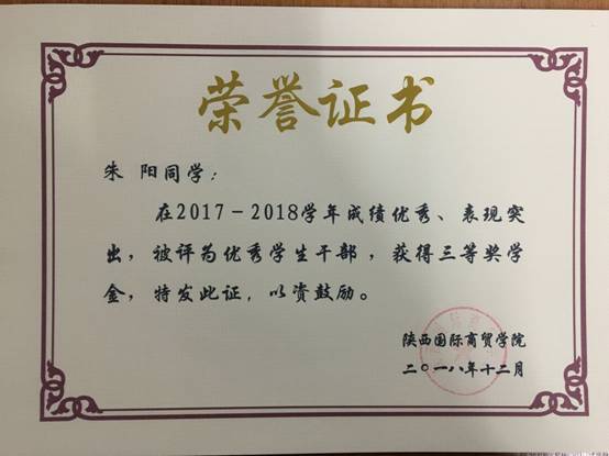 ——2017—2018学年“优秀学生干部三等奖学金”获得者 我院金融工程专业B1602班 朱阳