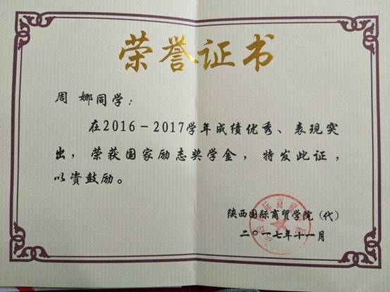 周娜,女,共青团员,江西宜春人,现就读于我院金融工程专业B1603班。她勤奋好学,努力进取,积极参加各类学科竞赛,先后在2017年全国大学生英语竞赛中获二等奖;在“外研社杯”全国英语竞赛中获一等奖;在“我的青春我的梦”学校征文比赛中获优秀奖;2016年获得“国家助学金”;在2016—2017学年以年级专业成绩排名和综合测评排名第三的成绩荣获“国家励志奖学金”。