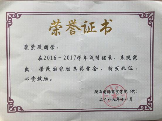2016—2017学年“国家励志奖学金”获得者 我院国际经济与贸易B1503班 裴紫薇