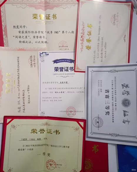 2020-2021年度第“激扬青春,辩以笃学”大学生辩论赛中荣获优秀团队奖。第八届“东方财富杯”全国大学生金融挑战赛省赛三等奖;“2022年第九届全国证券投资模拟实训大赛”全国赛中荣获团队二等奖;数学建模校赛一等奖。