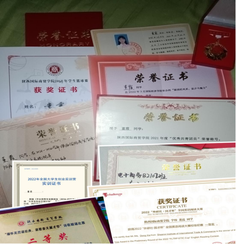 入学以来,曾获陕西国际商贸学院2021年篮球赛团体第四名;2021朗诵大赛团体三等奖;2022年4月荣获“优秀团员”称号及“优秀志愿者”称号;2022年10月荣获“外研社•国才杯”全国英语阅读大赛校级初赛一等奖。