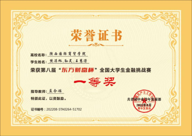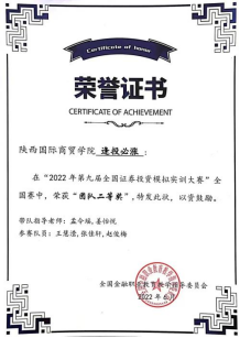 时光荏苒,岁月如梭,大二的一整个学年在充实学习中度过了。回首过往的一整学年,点点滴滴都是努力奋斗后的回报。大二一学年,我顺利通过大学英语CET-4考试,2021年大学生数学建模竞赛校赛一等奖、2021“外研社·国才杯”全国英语写作大赛一等奖、2022年第十二届电子商务“创新、创意、创业”大赛实战赛道二等奖、2022年全国证券投资模拟实训大赛团体二等奖、2022年“东方财富杯”证券模拟大赛省级一等奖、国家级一等奖,2021—2022学年我以平均成绩和综测并列专业第一获得国家励志奖学金。