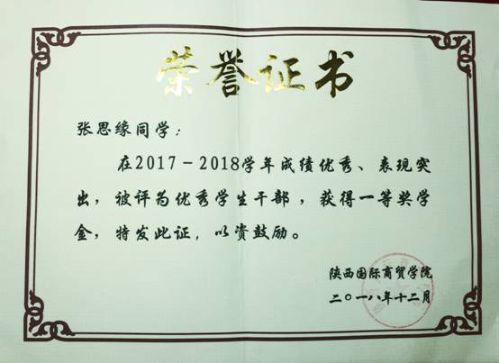 ——2017—2018学年“优秀学生干部一等奖学金”获得者 我院投资学专业B1701班 张思缘