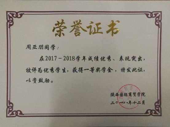 ——2017—2018学年“优秀学生一等奖学金”获得者 我院国际经济与贸易专业B1701班 周亚朋