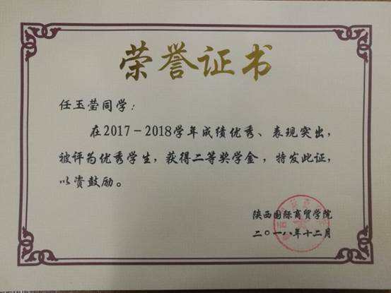 ——2017—2018学年“优秀学生二等奖学金”获得者 我院金融工程专业B1703班 任玉莹
