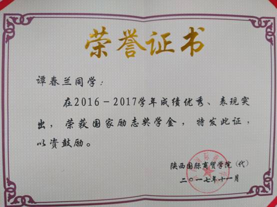 谭春兰,女,中共党员,重庆市开县人,就读我院国际经济与贸易专业B1401班,担任班级学习委员。她勤奋好学,成绩优异,2014年9月入学以来,先后在2014-2015学年获得“国家励志奖学金”;在2015-2016学年以年级专业成绩和综合测评排名第一的成绩荣获“国家奖学金”;在2015年首届校级数学竞赛和数学建模竞赛中分别荣获二等奖;在2015—2017连续三年全国大学生英语竞赛中分别荣获二等奖和三等奖;在2016年全国高校精英挑战赛“国泰安杯”流通赛陕西省总决赛及大陆地区总决赛中分别获得团体一等奖和二等奖;同年,在第七届全国大学生数学竞赛中荣获三等奖;她还顺利通过了大学英语四级、全国计算机二级、会计从业资格证书和初级会计专业资格证书。2016—2017学年在次获得“国家励志奖学金”。