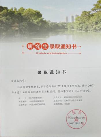她热爱生活,学习努力踏实,一直用行动证明着自己。2016年9月,她报考了2017年全国硕士研究生考试,通过初试、复试,现已被广西民族大学中国少数民族经济专业硕士研究生录取。