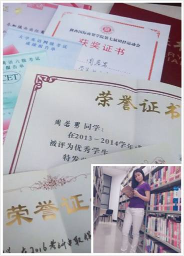 考取了国际市场营销二级证书,计算机MS office 二级证书,连续两年获学校“优秀学生”称号。还获得了2012年冬季长跑越野赛女子组第六名,第六届校运动会女子组3000米第三名,2014年学校手工艺作品大赛中获优秀奖。并在2013年的暑期社会实践中被评为“先进个人”。