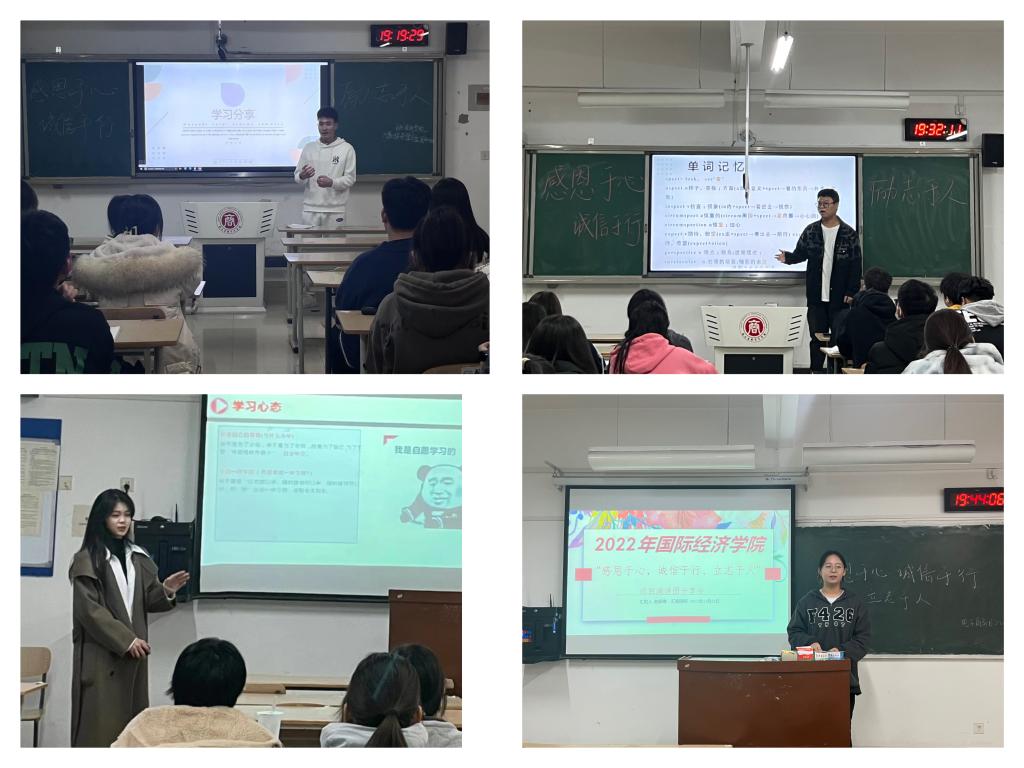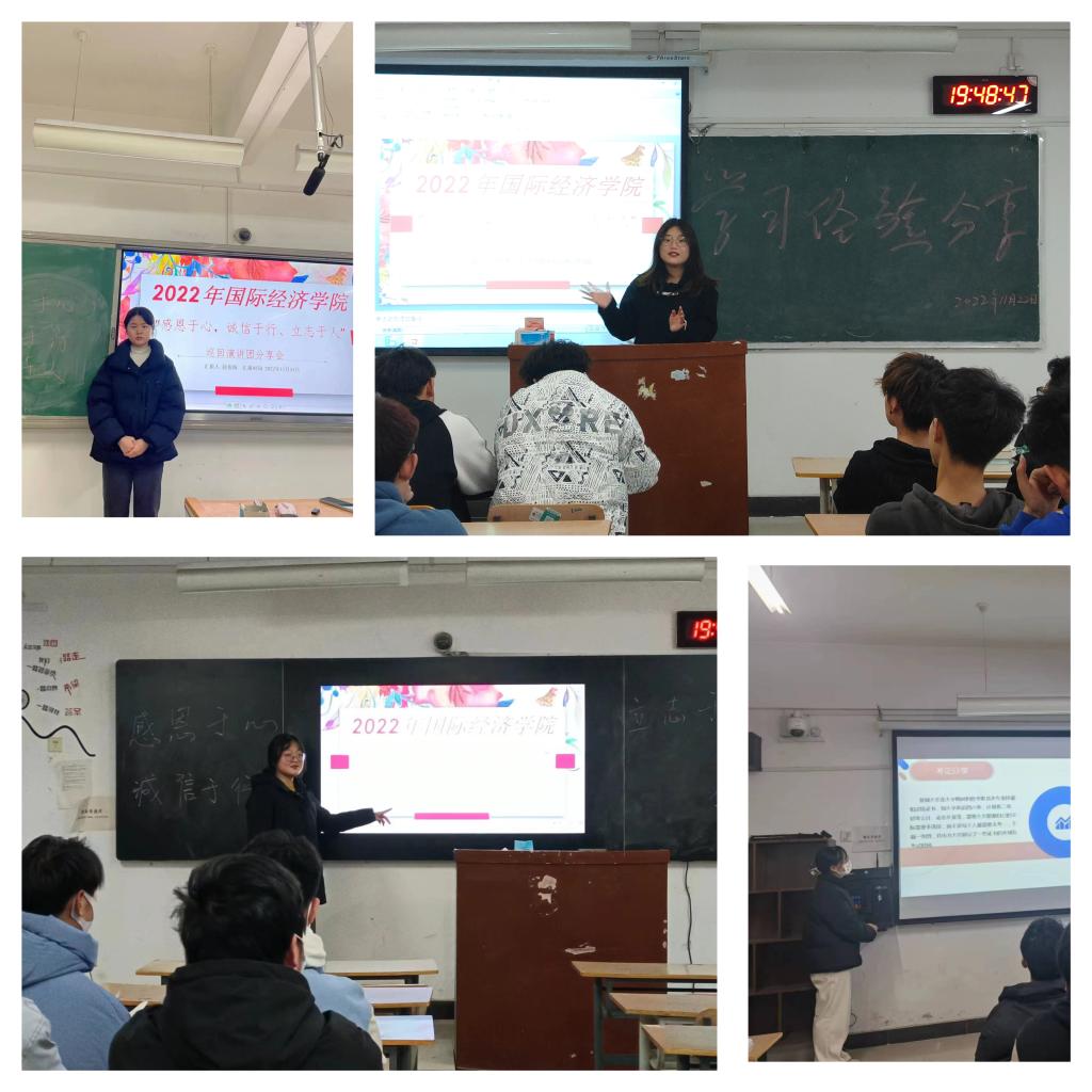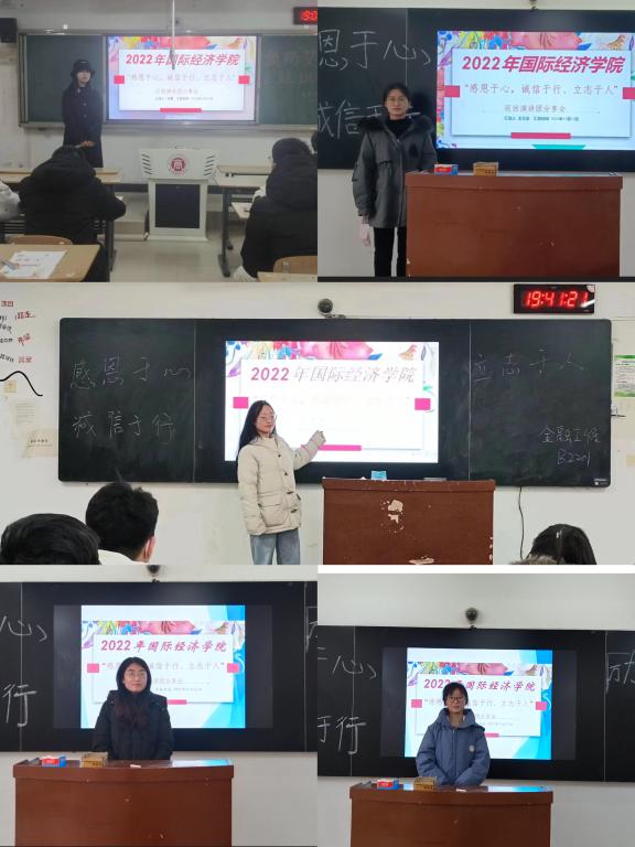 为增强大学生自尊、自信、自立的意识,促进大学生励志感恩教育,增强学生责任意识,引导学生诚信为本,提高自身修养,切实将大学生的思想政治教育与资助育人工作紧密联系起来,国际经济学院结合本学年各项奖助学金评选、资金发放等实际工作开展,特在 11 月份举办“感恩于心,诚信于行、励志于人”巡回演讲团分享会。
