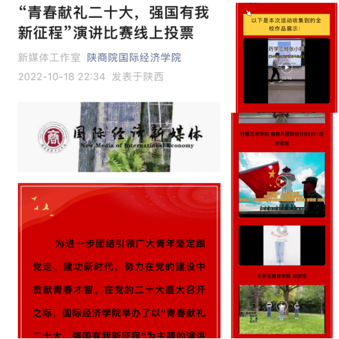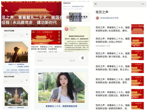 ——推出“青春献礼二十大,强国有我新征程”党员之声专栏系列报道。10月初开始,学院学生支部陆续推出“青春献礼二十大,强国有我新征程”党员之声系列专栏20期,讴歌中国共产党建党的开天辟地,到新中国成立的改天换地,通过各位学生党员切身感受来分享党史片段和百年历史故事,传达青年党员的学习感想和体悟,用青年的声音诉说红色历史,用青年的脸庞展现激扬精神风貌,用青年的行动迎接和学习党的二十大,弘扬新时代正能量,传播新青年好声音。