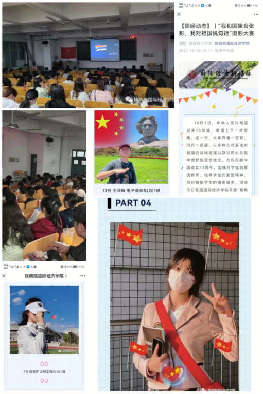 ——开展“我和国旗合张影,我对祖国说句话”摄影大赛、“看红色电影,树爱国情怀”观影活动。在新中国成立 73 周年之际,开展“我和国旗合张影,我对祖国说句话”摄影大赛、组织观看《建党伟业》、《开天辟地》等红色电影,搭建同学们抒发对祖国的热爱和诚挚祝福的平台,带领大家一起重温红色记忆,感受家国情怀,再一次重温党的历史,激发青年大学生努力拼搏,发奋学习,担负起建设社会主义现代化强国进程中的行动自觉。