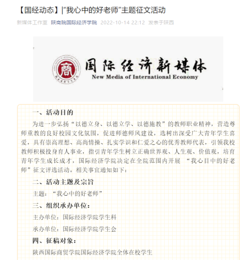 ——举办“我心中的好老师”主题征文活动。活动旨在通过学生视角,来进一步弘扬“以德立身、以德立学、以德施教”的教师职业精神,营造尊师重教的良好校园文化氛围,促进师德师风建设,选树出深受广大青年学生喜爱,具有崇高理想、高尚情操、扎实学识和仁爱之心的优秀教师代表,引领学院教师积极投身育人事业,指引青年学生树立正确世界观、人生观、价值观,培育青年学生更好成长成才。