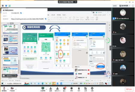 学院高度重视疫情防控工作,龚子腾老师严格按照属地疫情防控指挥部相关精神,向2022级新生详细讲述了国家疫情防控政策及学校的具体要求。讲座主要围绕两个方面进行:一是疫情形势和学生个人防护须知,二是学校疫情防控常态化要求。龚老师向同学们演示了核酸检测流程和线下线上请假流程,提醒同学们积极配合学校要求进行每每日健康打卡和按时核酸检测,做一个对个人负责对社会负责的合格大学生。